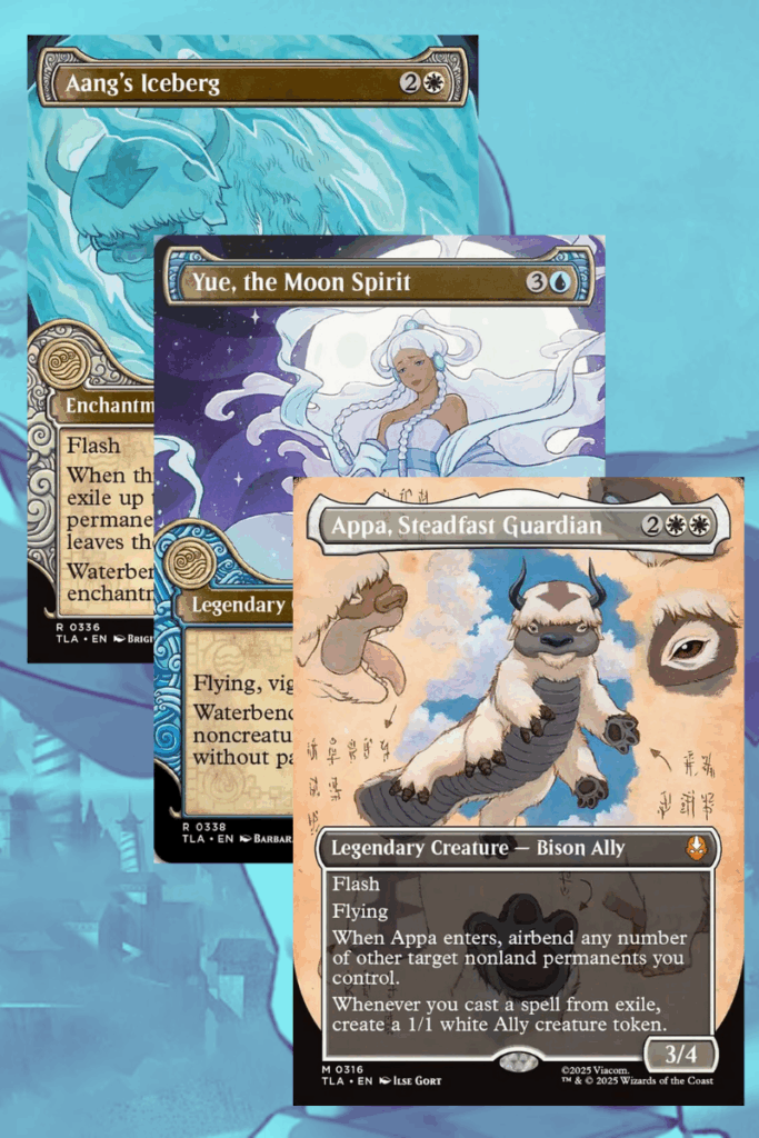 Alongside the Neon Ink cards, the set will feature a wide range of beautiful showcase and alternate-art cards. These designs draw heavily from the show’s iconic art style, capturing moments like Aang’s iceberg and Yue becoming the Moon Spirit, making each pack a visual treat.