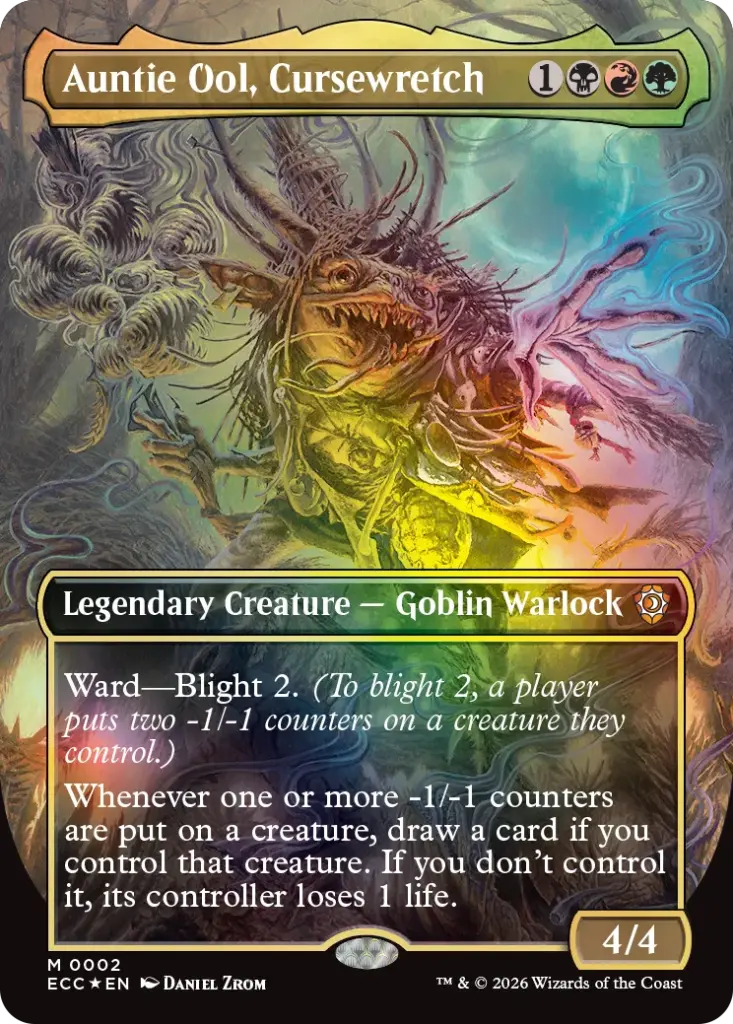 The new commanders themselves are already generating a lot of excitement. Ashling, the Limitless is being discussed as one of the most powerful five-colour Elemental commanders ever printed, enabling complex strategies with evoke creatures and token copying. Auntie Ool, Cursewretch finally provides a dedicated Jund (-1/-1 counters) commander, giving a home to many disparate cards from sets like Amonkhet and Shadowmoor.