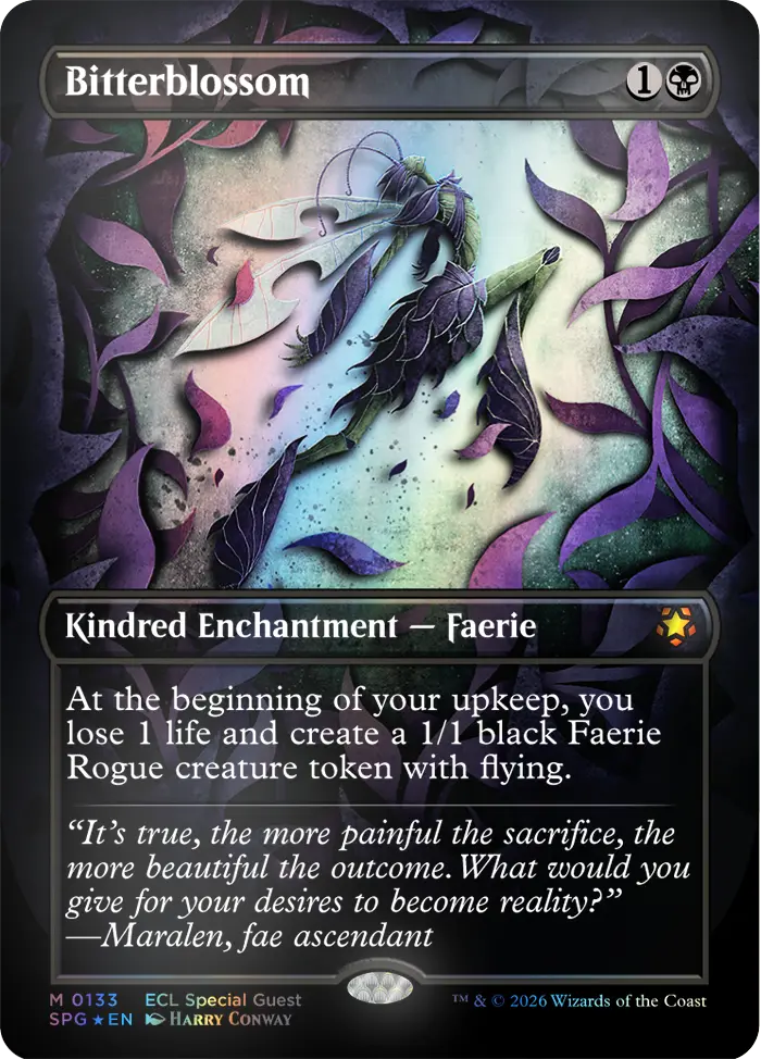 For collectors, the ultimate chase card will be the Serialized Bitterbloom Bearer. This is a special version of a classic Lorwyn card, Bitterblossom, featuring new artwork by Rebecca Guay. There will only be 500 serialized copies in existence, available exclusively in Collector Boosters.