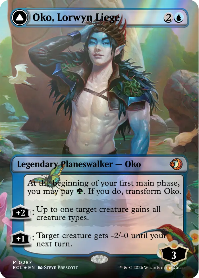 The face of the set is the new planeswalker, Oko, Lorwyn Liege. This transforming card starts as a Blue-aligned planeswalker in his Lorwyn form, but can be transformed by paying Green mana into Oko, Shadowmoor Scion, a much darker version of the character.