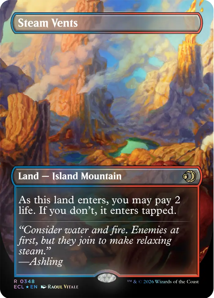 - Reversible Shock Lands: A full cycle of five borderless “shock lands” (like Steam Vents and Blood Crypt) are included in the set. One side of the card features artwork depicting a location in the bright world of Lorwyn, while the other shows its twisted counterpart in Shadowmoor.