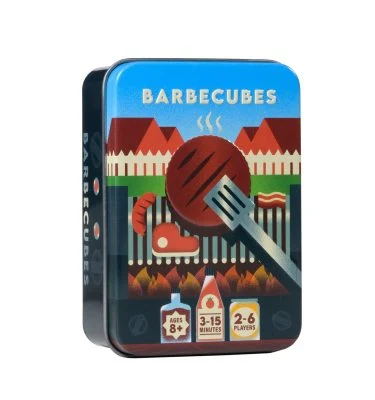 The Barbecubes game brings BBQ chaos to your table as 2-6 players draw cards and use shaky tongs to stack wobbly wooden food pieces like burgers, hot dogs, peppers and sausages onto precarious grills. As the grill towers higher, one wrong move sends items tumbling into the coals, earning penalty cards in this tense dexterity showdown perfect for families and Jenga fans alike. Quick to learn and play in 3-15 minutes, the Barbecubes game delivers non-stop laughs and replayability in a super-portable tin box ideal for holidays or spontaneous game nights.